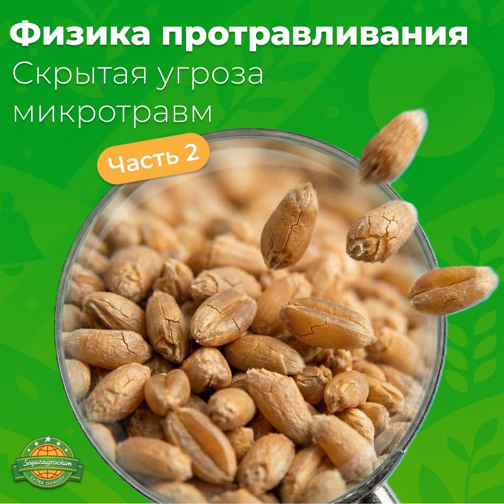 Часть 2: Скрытая угроза микротравм Семенная оболочка — это не просто упаковка, а инженерный барьер. Ее целостность гарантирует, что фунгицид останется снаружи и будет поступать внутрь дозированно. Но стоит этому барьеру рухнуть, как защита превращается в фактор риска. 1️⃣ Невидимый враг Повреждения делятся на явные (макротравмы) и скрытые (микротравмы). Если битое зерно (макротравмы) обычно отсеивается при сортировке, то микротрещины невидимы невооруженным глазом. Они создают опасную иллюзию качественного материала. Наличие даже 5–6% микротравм способно критически снизить полевую всхожесть. 2️⃣ Механизм «химического шока» Почему протравленное травмированное зерно гибнет? Многие современные системные действующие вещества (особенно группа триазолов: тебуконазол, тритиконазол) обладают выраженным ретардантным эффектом. При целостной оболочке препарат проникает внутрь семени медленно, по мере прорастания. При наличии трещин происходит мгновенный прямой контакт зародыша с высокой конц
