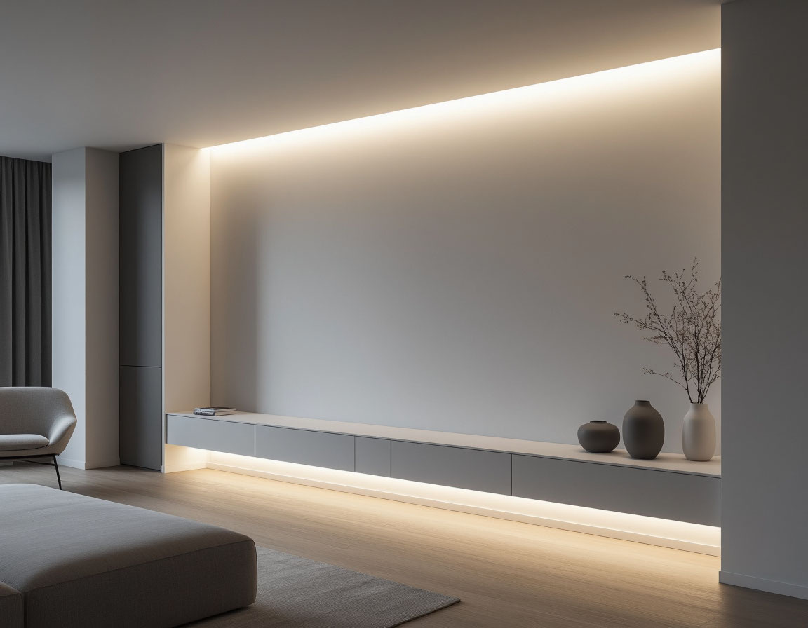 - Подсветка ниш и полок с декором — превращает обычные стеллажи в выставочные экспонаты.