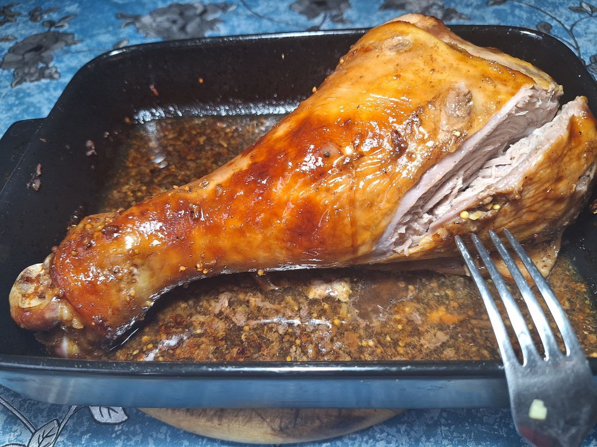 Голень индейки помыть и обсушить бумажным полотенцем. Подготовить маринад - все ингредиенты соединить, добавить специи и все хорошо перемешать.Подготовленным маринадом обмазать со всех сторон голень, накрыть и отправить в холодильник минимум на 3 часа. Маринованную голень выложить в форму для запекания, накрыть крышкой или пищевой фольгой, запекаем в течении 1 часа при температуре 180 гр 1 час. Затем снимаем крышку или пищевую фольгу и смазываем медовой глазурью, отправляем дальше запекаться до полной готовности индейки. Приятного аппетита!