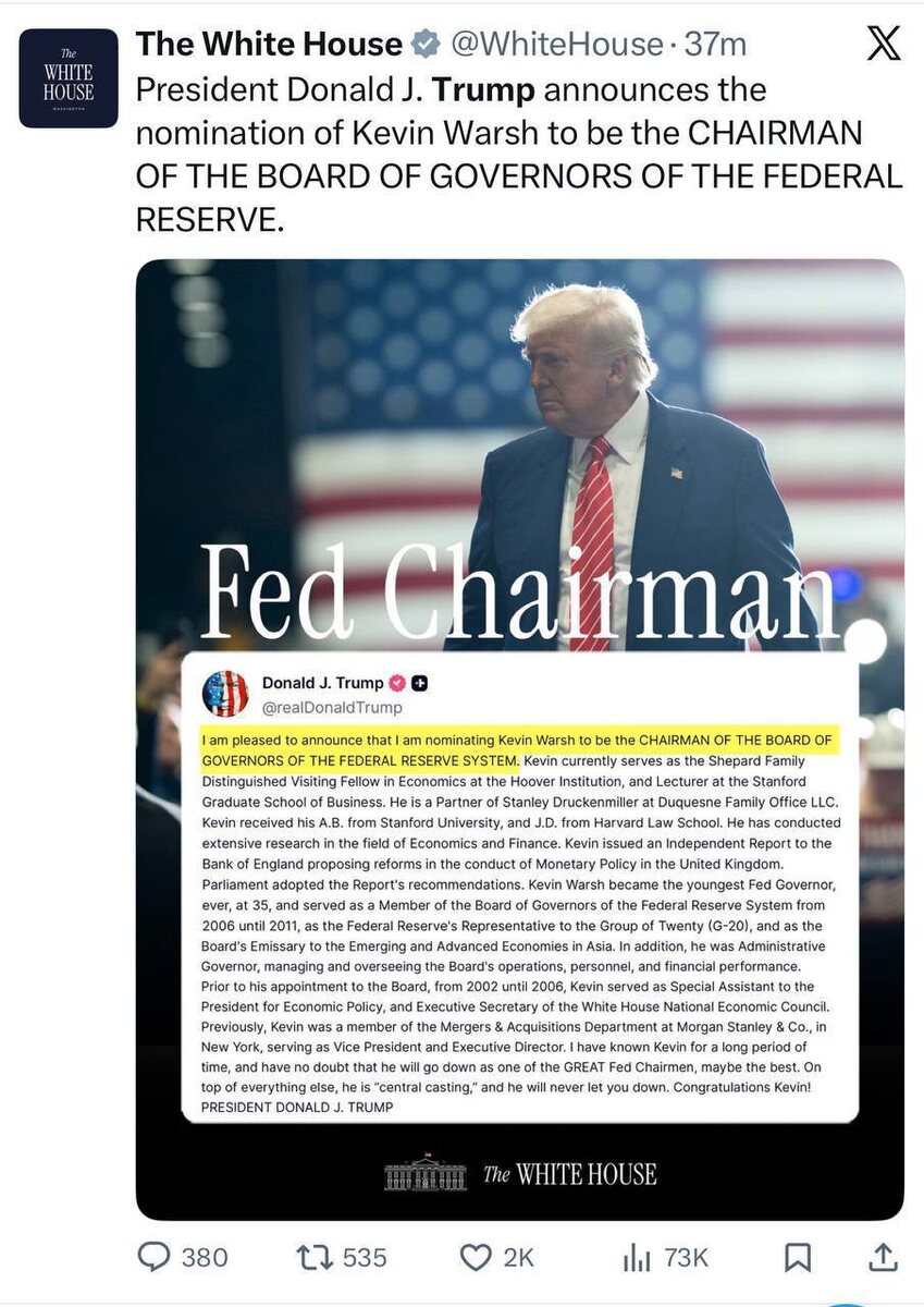 ! Им станет Кевин Уорш — бывший сотрудник ФРС и известный экономист, поддерживающий криптовалюты. Это долгосрочный позитив для нашего рынка. Вступит в должность он в мае 2026 года, после окончания срока полномочий текущего председателя. #ФРС #криптовалюта #новости BusineesEconomyBlockchain l Bybit