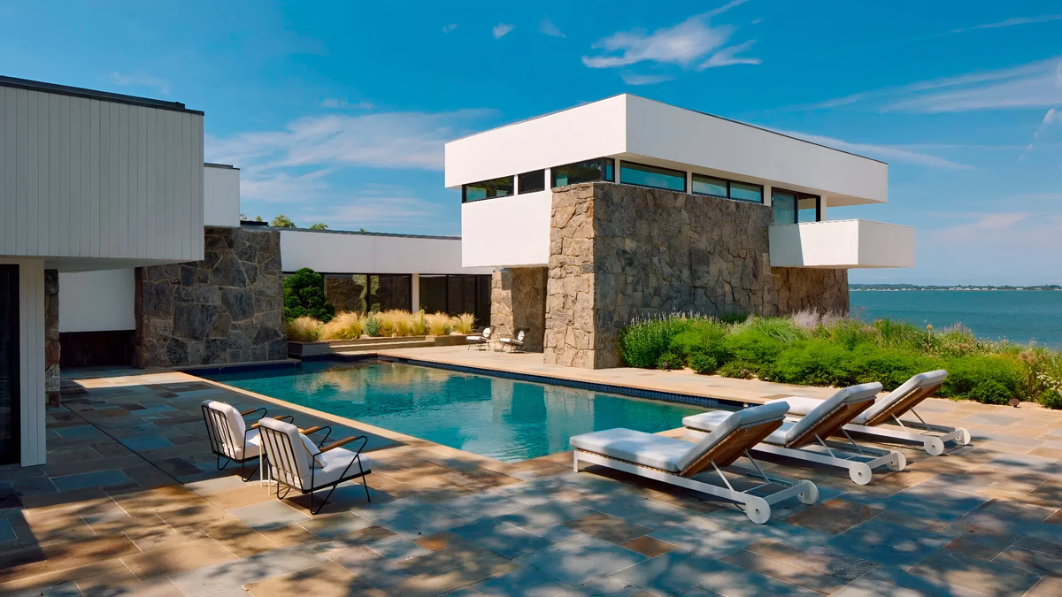Сегодня на Лонг-Айленде достаточно шумных районов и крупных построек, но в 70-е ритм островной жизни был медленнее, а архитектура обходилась без помпезной роскоши. Именно тогда у нью-йоркского побережья и появился дом Ософски, спроектированный известным американским архитектором Норманом Джаффе. Со стороны кажется, будто здание состоит из нескольких отдельных блоков, а не является единой конструкцией. Эту иллюзию создают панорамные окна, благодаря которым пейзаж становится частью интерьера, а естественный свет проникает в дом со всех сторон. Для отделки — как снаружи, так и внутри — использовались кедровая древесина и натуральный камень. Светлый интерьер с нежным текстилем в гостиной смягчает грубоватость каменных стен, гармонично сочетаясь с океанским пейзажем. Хотя дом и подвергся реконструкции, обновлённая цветовая палитра и современная умная техника не мешают духу 70-х жить в каждом его уголке: в ярких картинах на стенах, мягких коврах, плетёных стульях и геометрических узорах деко