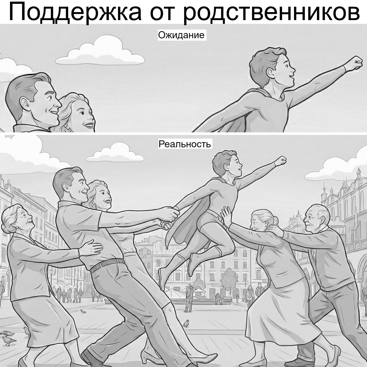 Предположим, вы решили сделать что-то важное и хорошее для себя. Например, разбогатеть, первым за пару поколений. Или поехать учиться. Или, наоборот, пойти зарабатывать деньги вместо 5 лет пинания зачетки. Или спортом заняться. Или что-то еще. По вашим прикидкам это все нужно, полезно и вообще получится. И вы решаете про это рассказать окружающим, чтобы они вас поддержали и вообще порадовались. А они, внезапно, начинают вам рассказывать что ничего не получится, что это все опасно и бессмысленно, и вообще нужно жить как они - плохо, но стабильно. И чем больше вы им рассказываете про свою позицию - тем больше формируется группа против вас, включая бабушек, тетушек, дядей и знакомых с работы, которые вам рассказывают как все это неправильно и вообще как вы посмели. Что же делать, какие слова подобрать, чтобы они стали на вашу сторону? Как переубедить? Никак. Никак не переубедить. Более того - это и невозможно, и бессмысленно. В первую очередь потому, что желание поддержки и одобрения - эт