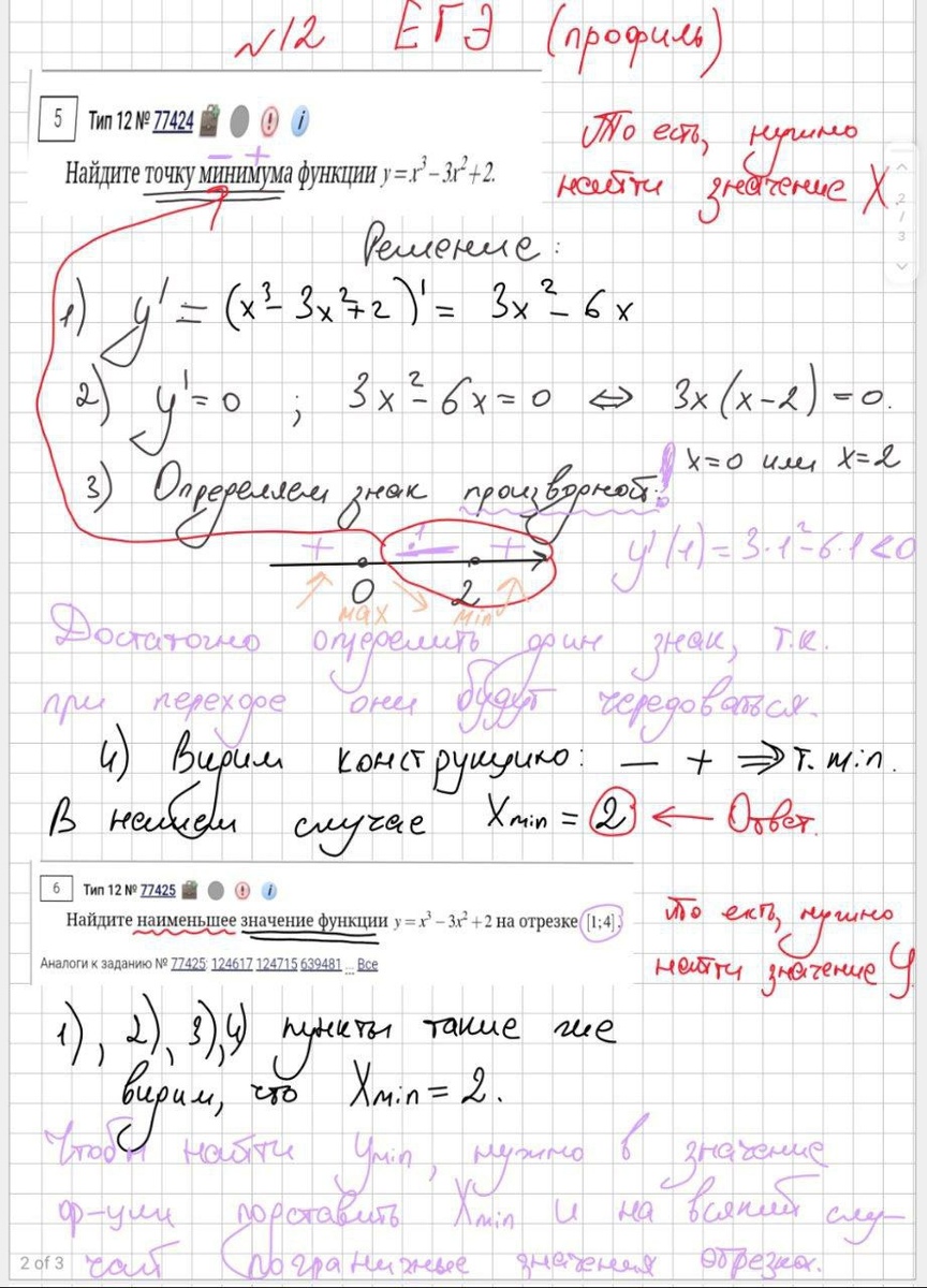 ) Что нужно для того, чтобы решить данное задание? 1. Знать таблицу производных 2. Понимать суть задания и вчитываться в "дано" 🔠Если написано "найти ТОЧКУ", значит, ищем значение "x" (Xmin или Xmax) 🚩Если написано "найти ЗНАЧЕНИЕ ФУНКЦИИ", значит, ищем значение "y" (y min или y max) Алгоритм решения задания: 1. Ищем производную данной функции 2. Приравниваем производную к нулю, чтобы найти точки пересечения нашей производной с осью "x" (т.е., ищем иксы) 3-4. Ищем точку минимума или максимума (Xmin, если у нас переход от - к +; Xmax, если у нас переход от + к -) 5. Если требуется найти значение функции, то ищем y min или y max, подставляя в нашу функцию Xmin (если нужно y min) либо Xmax (если нужно y max) и значения на концах отрезка. 🐈Чтобы вы лучше поняли материал, я прорешала два идейных прототипа ЕГЭшных (их всего два так то) и прикрепила задания для самостоятельной прорешки Boostик