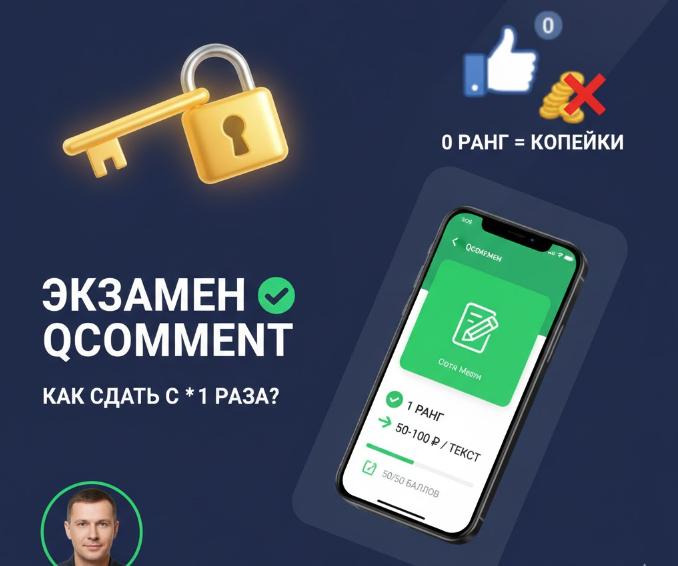Многие новички на бирже QComment годами остаются на «нулевом» ранге, перебиваясь копеечными лайками и репостами. Причина большинства — страх перед экзаменом. На практике проверка несложная, а после её прохождения открывается доступ к заказам на отзывы, которые оплачиваются заметно выше. В этой статье я разберу, как пройти проверку без ошибок и что именно хотят видеть модераторы. Без сданного теста вам доступны только социальные действия (лайки, вступления в группы). После успешной сдачи вы получаете 1-й ранг, который открывает доступ к: Экзамен состоит из двух этапов: Внимание: На QComment действует правило — экзамен сдается один раз. Второй попытки не будет. Если модератор отклонит ваш текст из-за ошибок или низкой уникальности, доступ к написанию комментариев будет закрыт навсегда. Чтобы модератор принял ваш экзаменационный текст, соблюдайте эти критерии: Искать готовые ответы на тест QComment в сети бесполезно, вопросы постоянно меняются, лучше выучить базовые правила. Результаты эк