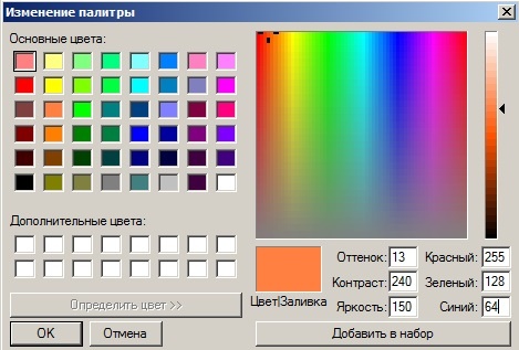 Но можно и задавать в соответствующих окнах значения Оттенка, Контраста и Яркости, и тогда правее отобразятся соответствующие значения RGB. Тем самым, мы имеем 2 независимые системы задания цвета, с однозначным взаимным переводом показателей из одной системы в другую.