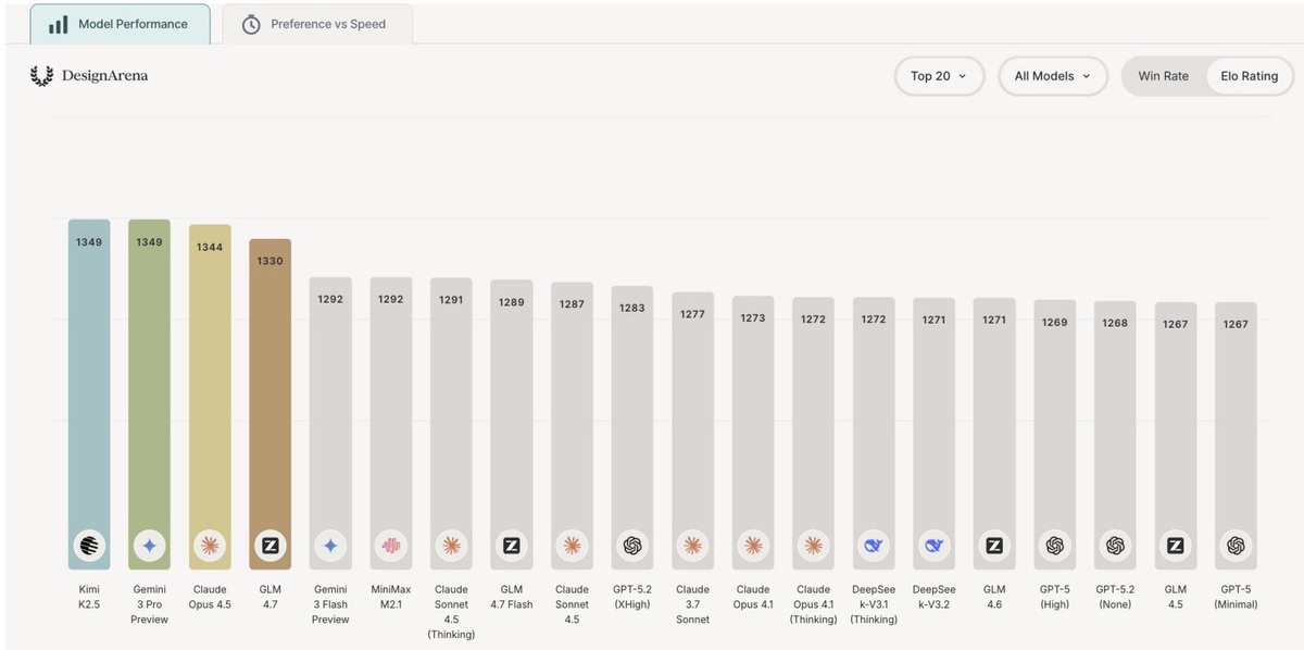 ⚡ Kimi K2.5 вошла в тройку лучших ИИ для дизайна — первая открытая модель на этом уровне