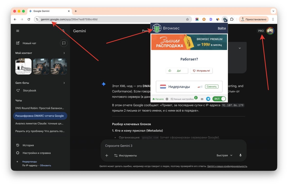 В общем Gemini Pro удалось запустить на моем MacMini только в отдельном браузере с таким расширением