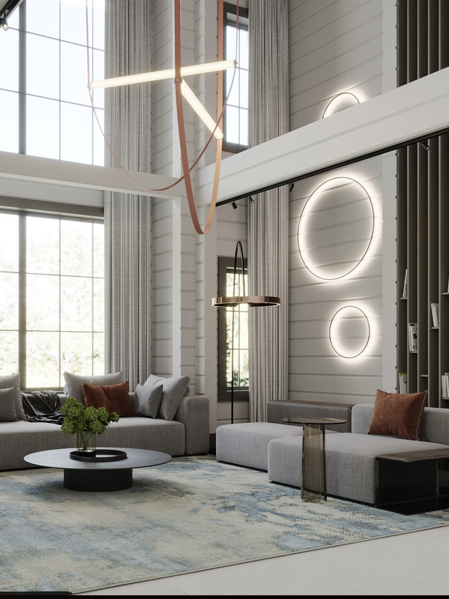 Знакомимся ближе с интерьером деревянного дома Усадьба. Сегодня — гостиная и лестничный холл. Дизайнер Александра Петунина Paleks Design смело работает с формой: трендовые округлые панели, мягкие линии, тактильная геометрия.