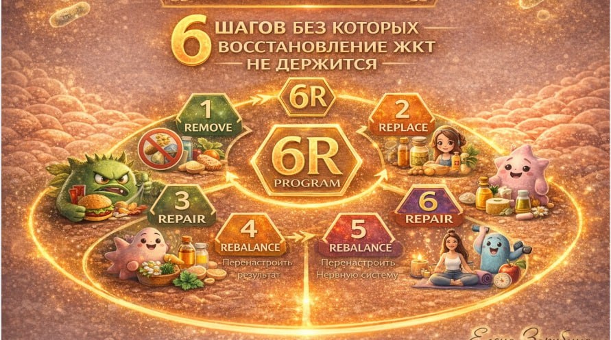 Это система, где важно: Если вмешательство идёт хаотично — результат не удерживается. И именно здесь появляется 6R. 6R — это международный подход к восстановлению кишечника,