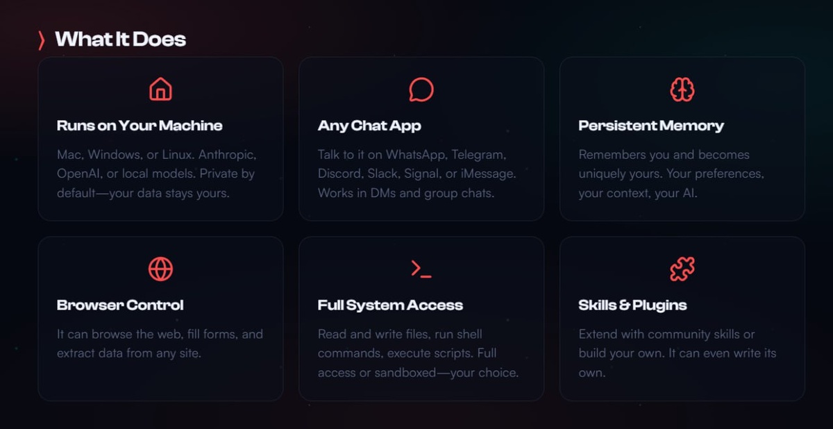 Clawd — это персональный AI-агент, который работает локально и умеет действовать в реальной системе, а не просто отвечать в чате. Запускается на Mac, Windows и Linux, при этом поддерживает модели Anthropic, OpenAI и локальные LLM. Обещают приватность — данные остаются у вас Ключевые возможности: • Постоянная память — запоминает вас, контекст и предпочтения • Управление браузером — серфинг, заполнение форм, сбор данных • Полный доступ к системе — файлы, команды, скрипты (или sandbox) • Навыки и плагины — подключение готовых или создание своих • Может писать собственные навыки под новые задачи Работает в личных и групповых чатах. Управлять агентом можно прямо из мессенджера. #нейросети #ИИ #нейросеть #искусственный_интеллект