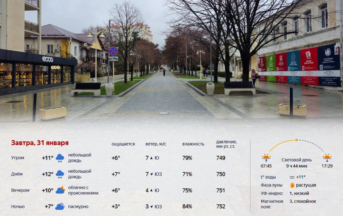 Завтра, 31 января, в Краснодаре ожидается влажная и ветреная погода. Утром около +11° с небольшим дождём и южным ветром. Днём до +12°, осадки сохранятся, ветер сменится на юго-западный. Вечером дождь прекратится, температура около +10°, ночью пасмурно и прохладнее около +7°. Световой день продлится 9 часов 44 минуты, восход в 07:45, закат в 17:29. Температура воды +11°, УФ-индекс низкий, магнитное поле спокойное. Подробнее: https://краснодарскийкрай.рф/news/prognoz-pogody-v-krasnodare-na-31-janvarja-2026-goda.html Прогноз погоды на неделю: https://краснодарскийкрай.рф/pages/weather-forecast.html #погода #прогнозпогоды #температура #осадки #ветер #климат #метеопрогноз #краснодар #краснодарскийкрай