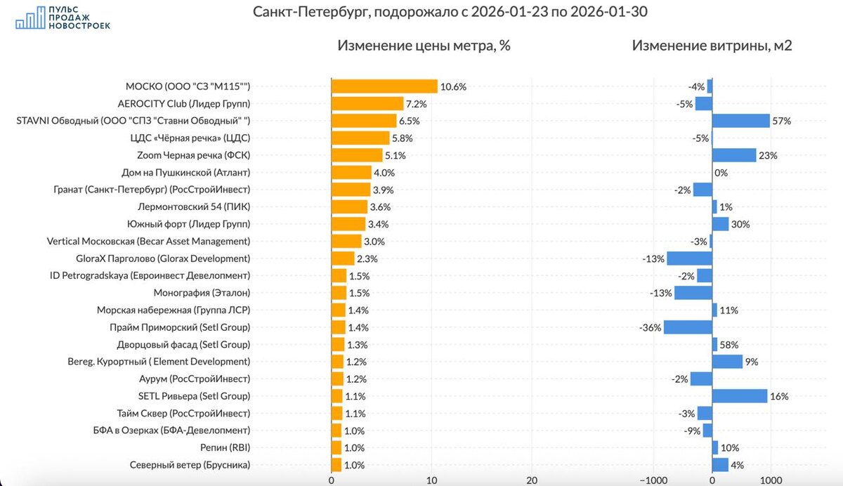 💰 Смотрим без премиум и элит классов. 💵 За 7 дней цена метра выросла на 0.3% до 323 500 рублей за метр. 📈Топ изменения цен (подорожало): 1️⃣ЖК "МОСКО" (ООО "СЗ "М115"") цена метра +10.6%, витрина предложения уменьшилась на -87м2 2️⃣ЖК "AEROCITY Club" (Лидер Групп) цена метра +7.2%, витрина предложения уменьшилась на -289м2 3️⃣ЖК "STAVNI Обводный" (ООО "СПЗ "Ставни Обводный" ") цена метра +6.5%, объем витрины при этом увеличился на 981м2 🪫Анти топ (подешевело): 1️⃣ЖК "Pulse Premier" (Setl Group) -2.8% в цене, витрина предложения уменьшилась на -31м2 2️⃣ЖК "Сенат" (Setl Group) -1.8% в цене, объем витрины при этом увеличился на 96м2 3️⃣ЖК "N8" (ФСК) -1.7% в цене, витрина предложения уменьшилась на -1798м2 ☄️Объем предложения жилья в регионе за неделю практически не изменился, всего -0.3% (-4411 м2) Все изменения в регионе на картинке. ‼️Только для наших подписчиков в телеграмм - сервис истории цен для поиска выгодных предложений и аналитики по проектам ПИК https://hist.pulspr