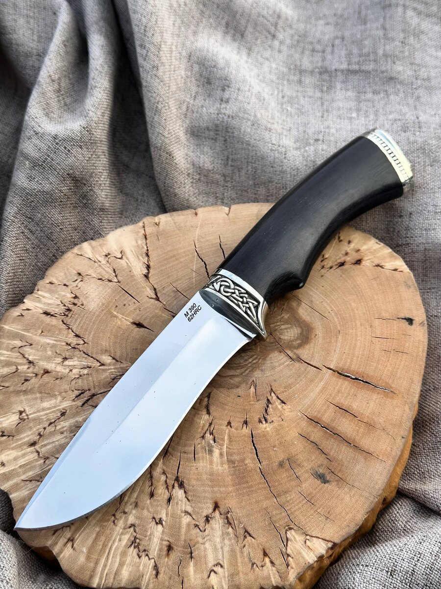 чёрного граба и мельхиора. Сталь M390 обладает высокой твердостью (HRC 62, после криообработки), хорошо держит заточку, имеет хорошую пластичность. Размеры ножа: длина клинка 118 мм, ширина 31 мм, толщина 2,4 мм, длина рукояти 122 мм. На клинке чуть вогнутая линза от середины спусков, фальшлезвие на передней части обуха, финишная полировка в зеркало, заточен до бритвенного состояния. Цена ножа 15.142 руб., обычная цена 20189 руб. Можем изготовить формованные ножны из кожи растительного дубления (+ 8000 руб.) Для заказа писать на @Nazarklinokbot или по тел +79101343831, WhatsApp, Viber.