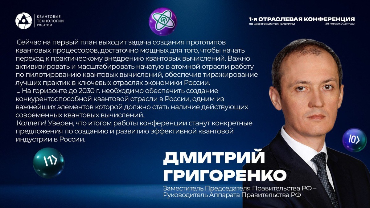 🗣 Приветствие в адрес Первой отраслевой конференции по квантовым технологиям поступило от заместителя Председателя Правительства Российской Федерации – руководителя аппарата Правительства Дмитрия Григоренко.