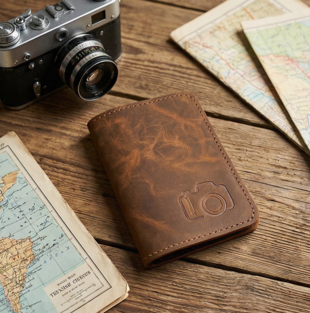 Вечная классика в деталях — тиснение фотоаппарата на прочной коже Crazy Horse.