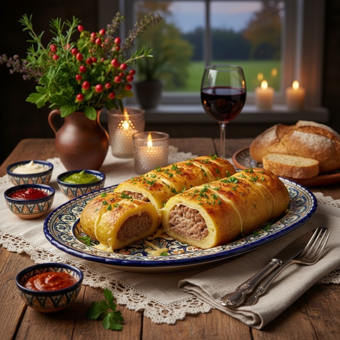 Ингредиенты⤵️ 🔸Картофель — 1 кг 🔸Яйцj — 2 шт. 🔸Мука — 5 ст.л. 🔸Фарш мясной — 400 г 🔸Лук репчатый — 1–2 шт. 🔸Морковь — 1 шт. 🔸Томатная паста — 1 ст.л. 🔸Соль, перец, специи — 2 щепотки 🔸Масло растительное — 2 ст. Приготовление🥔 1. Картофель отварить до готовности, размять в пюре без добавок. Остудить. 2. Добавить в пюре яйца, муку, соль, перец. Вымесить мягкое тесто. 3. Для начинки: лук и морковь мелко нарезать, обжарить. Добавить фарш, жарить до готовности. Приправить томатной пастой, специями, остудить. 4. На влажную пищевую плёнку выложить картофельное тесто, раскатать в прямоугольный пласт толщиной 1–1,5 см. 5. Равномерно распределить начинку, оставив края. 6. С помощью плёнки аккуратно свернуть рулет. Переложить швом вниз на противень с пергаментом. 7. Выпекать при 180°C 30–40 минут до золотистой корочки. Рецепт дня #картофельный_рулет #мясной_рулет #картофель #фарш_мясной #специи #овощи