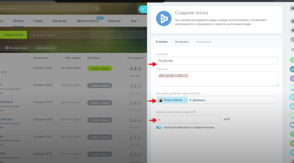 - Создаем поток. Задаем название («Поток №1: Первичный контакт с лидом»), выбираем, кто может добавлять задачи (обычно руководители), устанавливаем среднее время выполнения (например, 1 день).