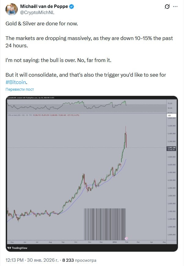 Рынки обваливаются, упав на 10-15% за последние 24 часа. Я не говорю, что бычий тренд завершён. Нет, это далеко не так. Но сейчас наступит период консолидации, и это именно тот триггер, который вы хотели бы видеть для биткоина.