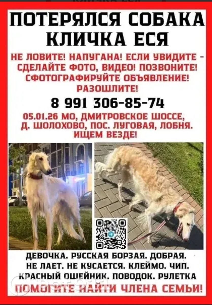 В нашем примерно регионе (север Московской области) ищут убежавшую русскую псовую. Пост публикую в рамках помощи, хотя прекрасно понимаю что шанс мал: меня читают не только в нашем регионе, а тэги в Дзене больше не работают. Однако всегда есть шанс, и пусть Есе повезет! Собака убежала вместе с ошейником и поводком-рулеткой, испугавшись салюта. Владельцы её очень ищут и надеются найти, так что размещаю объявление о пропаже, и в который раз предупреждаю читателей об опасности выгул собак на рулетках. Много дней её не видели, нет ни одного достоверного сообщения, и я очень надеюсь что молодую псицу кто-то подобрал: лучше так, чем голод и такой собачий холод. Ваша грустная Нос-К-Носу