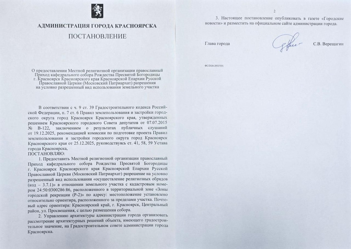 ! Глава Красноярска в своём телеграм‑канале объявил, что подписал постановление о строительстве собора на набережной — того самого, который годами делит мнение жителей: быть или не быть. Сегодня подписал постановление. Первый пункт – технический, хотя и обязательный для подобных проектов. Он уточняет вид использования земельного участка, который по факту действует с 2016 года, сообщает Сергей Верещагин Однако при внимательном знакомстве с документом становится ясно: именно первый пункт — ключевой. В нём прямо указано, что земля передаётся Красноярской Епархии для размещения собора. То есть постановлением фактически закреплено: земля передана — собору быть. Вопросы о дополнительных обсуждениях архитектурных решений на градостроительной комиссии выглядят уже второстепенными: такие комиссии действительно рассматривают крупные проекты, но сама передача земли снимает главный вопрос. Отдать должное мэру и его PR‑команде — информация о фактическом разрешении всех споров подана очень ум