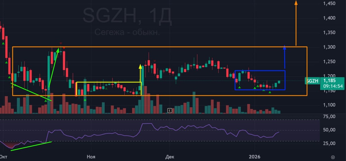 🪓 Сегежа! 🟢Чтобы не рисовать заново все прямоугольники, возьму картинку из прошлого моего поста по Сегеже. В настоящий момент, мы вышли вверх из синего накопления, и отработали синюю стрелочку. На пике этой синей стрелочки я вчера закрыл Сегежу. Но не потому, что я верю в её кончину, а перезахода ради. 🟢 Логика остается прежней - у нас есть большой прямоугольник поносного цвета, как только пробьем 1,300, то полетим по поносной стрелочке вверх. 🟢Что в текущей ситуации? Идет просто тест синего накопления, как мне кажется. 🚗 Жду Сегежу снова на 1,300, но уже с пробоем и закреплением, потом еще выше. Цели наверх проставлю, когда буду писать о Сегеже в следующий раз #сегежа #sgzh #bogdanoffinvest $SGZH $SZH6 $SZM6