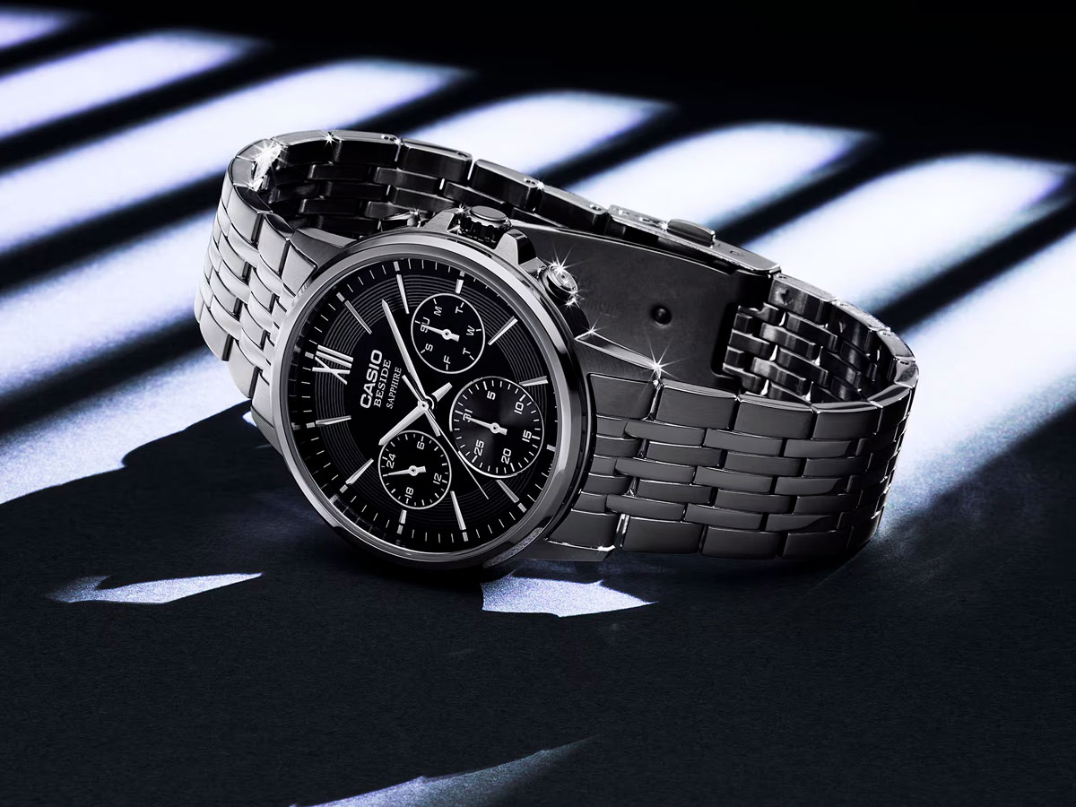 Пока фанаты наслаждаются новостями о роскошных MTG и MRG, касиовцы не забывают и про бюджетную линейку STANDARD — среди новинок января мы обнаружили симпатичную серию BMS-300. Если вы вдруг забыли, то у CASIO есть линейка Beside, которая условно входит в состав вышеупомянутого направления STANDARD, и предлагает корпуса с изысканным и утонченным дизайном для поклонников классики со стрелками — новинка BMS как раз из этой коллекции. Казалось бы, сколько мы уже видели подобных циферблатов, но японские дизайнеры всегда стараются придумать что-то новенькое. Тонкие стрелки, часовые метки и наличие римских индексов намекают на классический подход к стилистике наручных часов. Внешний периметр циферблата «пронизан» кольцевидным рисунком, а доп. окошки будто бы напечатаны на поверхности. Вы наверняка заметили надпись SAPPHIRE — да, и у дешевых моделей тоже иногда встречается сапфир. Таких серий у CASIO не очень много, но они всегда пользуются спросом. Сапфировое стекло, как вы знаете, обладает л