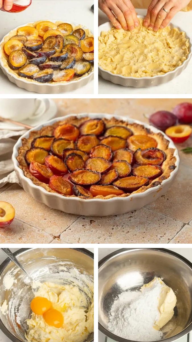 7. Выложите сливы поверх теста срезами вверх, посыпьте сахаром и корицей. Запекайте пирог при 180 °C около 30-35 минут.