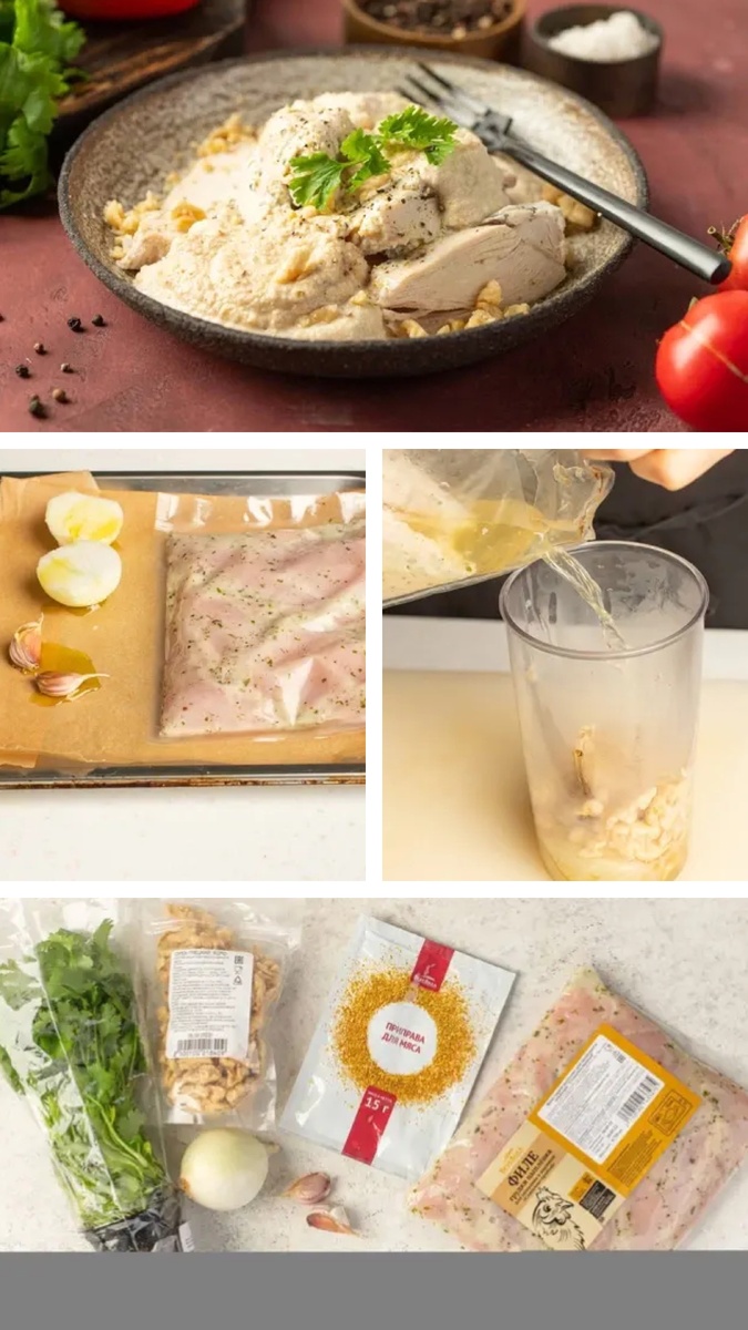 5. Мясо нарежьте кусочками и залейте ореховым соусом. Подавайте со свежей кинзой и тёплой лепёшкой.
