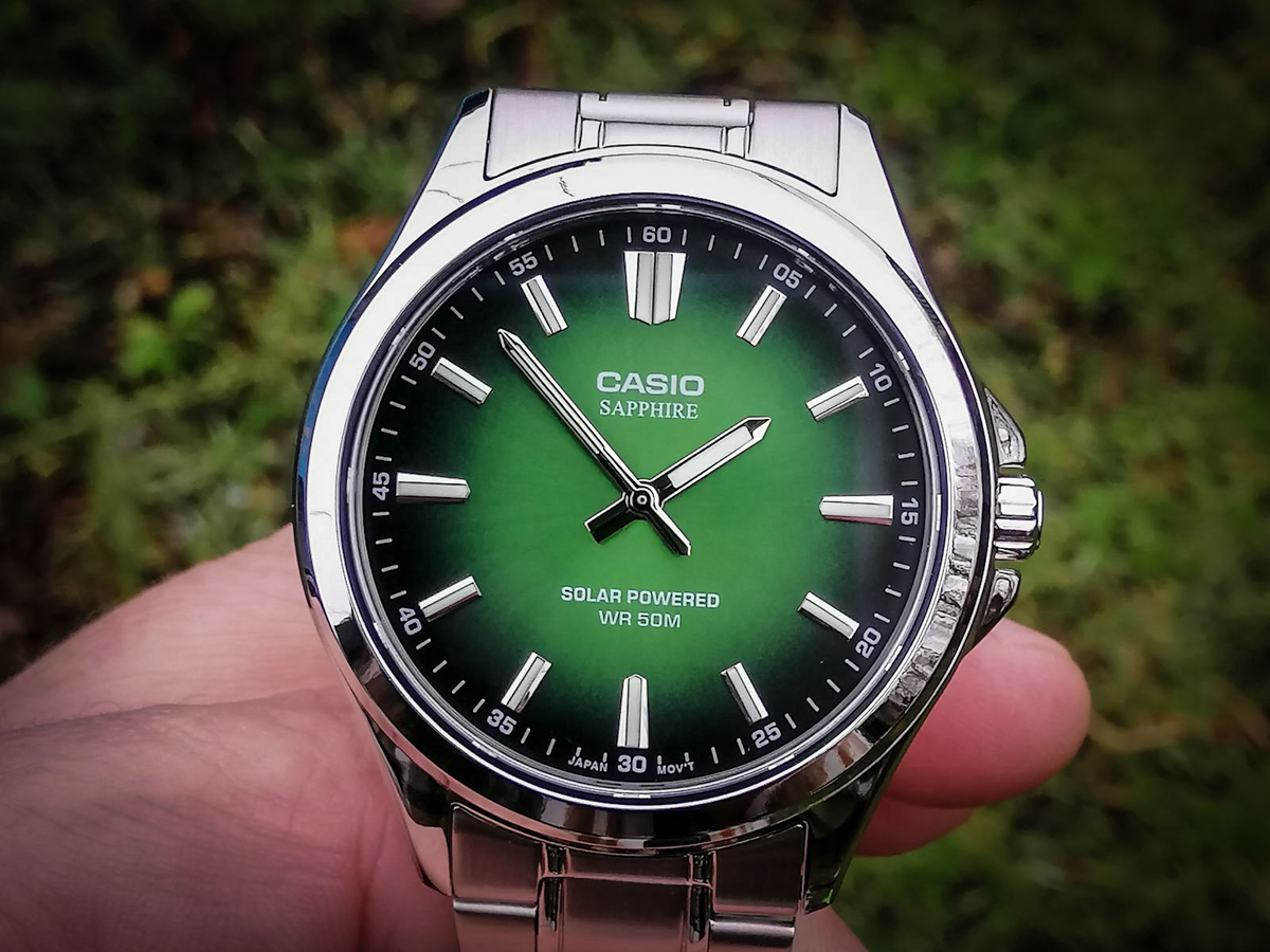 Никак не могу налюбоваться этим красивым градиентом в классическом корпусе. Этого вы никогда не увидите на профильных изображениях модели. Столько разных циферблатов уже создали касиовцы, но это уже совсем другой уровень. Причем это не просто металлическая пластина с покрытием, а поверхность, которая еще и пропускает солнечные лучи для подзарядки нашего аккумулятора. Разве это не замечательно? Как будто под сапфиром у нас есть еще один драгоценный полупрозрачный изумруд.