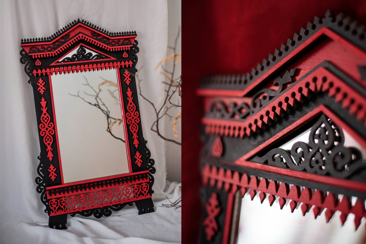 Наверняка, многие уже видели, что сейчас есть тренд на новую жизнь для старых изделий и элементов декора. Одним из таких элементов являются старые резные наличники. Их реставрируют и делают внутри полочки или добавляют зеркала. В интерьере это смотрится очень необычно и красиво. Идея сделать зеркало-наличник своими руками пришла ко мне не сразу. Несколько лет назад я увидела, как в старый деревенский наличник добавили зеркало и это настолько впечатлило меня, что идея о таком элементе интерьера не покидала меня долгие годы. И вот спустя время я наконец решила, что все-таки сделаю такое зеркало, пусть оно и будет составлено из деталей, вырезанных на лазерном станке и значительно меньше по размеру, чем настоящие наличники. Так и начался мой увлекательный путь от отрисовки деталей и разработки макета до финального варианта. Нужно сказать, что для того, чтобы мои наличники выглядели правдоподобно я пересмотрела огромное количество фотографий деревенских окон, внимательно всматривалась в к