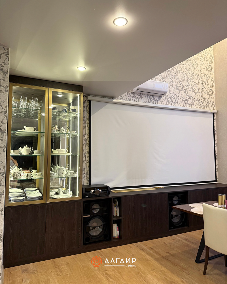 Мы создали ТВ-зону, которая идеально вписывается в интерьер. Роскошная витрина, за стеклом которой располагаются красивейший сервиз и бокалы.