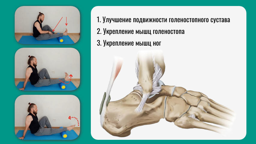 - Улучшение подвижности голеностопного сустава: Упражнение помогает увеличить диапазон движений в голеностопе, что особенно полезно для людей с ограниченной подвижностью сустава.