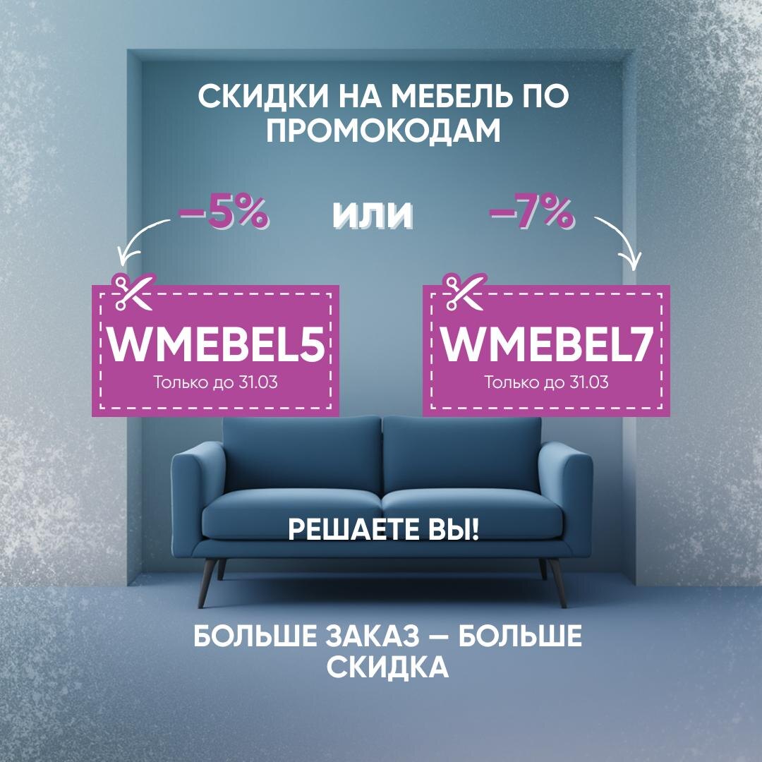 Выбирайте тот, который вам подходит 👇 📣 Промокод WMEBEL5 ▶️ –5% на весь ассортимент Подходит, если планируете покупку от 50 000 ₽ Хороший вариант для обновления одной комнаты — диван, кровать, шкаф, прихожая или кухня. 📣 Промокод WMEBEL7 ▶️ –7% на весь ассортимент Работает при заказе от 100 000 ₽ Идеально, если обставляете квартиру целиком или делаете крупное обновление. Как воспользоваться: 1️⃣ Выбираете мебель на сайте vsyamebel.shop 2️⃣ Добавляете товары в корзину 3️⃣ Вводите промокод WMEBEL5 или WMEBEL7 4️⃣ Получаете скидку сразу при оформлении 📌 Промокоды действуют на всю мебель при полной онлайн-оплате на сайте. На оплату при получении действует обычная цена. 📌 Срок действия — до 31.03.2026 Если сомневаетесь, какой вариант выгоднее именно вам — напишите нам, мы всё посчитаем и подскажем. 📲 Контакты: Telegram/МАХ/WhatsApp: +7 902 207-76-17 VK: vk.com/vsyamebel.shop 🌐 vsyamebel.shop 📦 Доставка по 45+ городам России 💳 Рассрочка без переплат: Сбер / Халва / Сплит