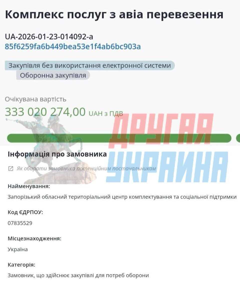 Областной ТЦК во временно оккупированном боевиками Запорожье Запорожье объявил тендер на 333 миллиона гривен (7,8 млн долл) на авиаперевозки. Складывается ощущение, что сотрудников готовят не к «службе», а к экспедиции на орбиту. Либо начальник запорожского ТЦК Марущак решил летать сугубо частными самолётами, пока простых украинцев ловят по улицам и отправляют на фронт. Сайт "Другая Украина" / Telegram / Вконтакте / Центр поддержки Украинцев / Жалоба на ТЦК "Другая Украина" теперь в МАХ