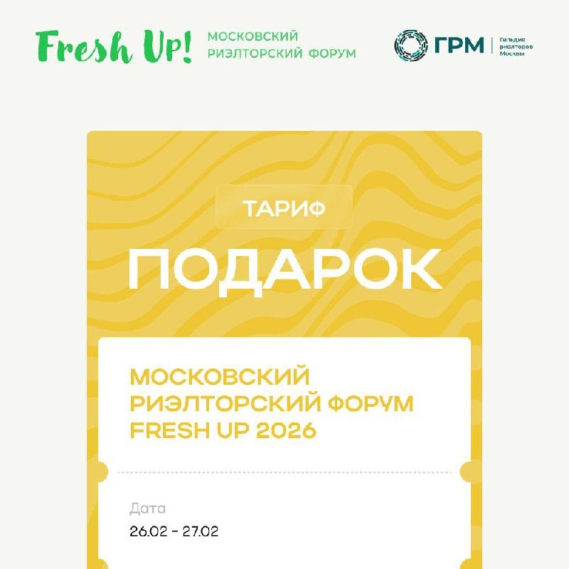 Fresh Up 2026 – это форум, который в этом году действительно открыт для всех. Тариф «Подарок» – это возможность бесплатно стать частью главного риэлторского события Москвы и провести два дня в сильной профессиональной среде. ⚡️Количество бесплатных билетов ограничено и доступно до 12 февраля ⚡️ Что входит: ✅ посещение всей деловой программы 26 и 27 февраля ✅ пакет участника форума ✅ участие в розыгрышах от партнёров ✅ скидка 20% на первичную аттестацию специалистов по недвижимости (26–27 февраля, зал «Ордынка») Мы сделали этот тариф, чтобы поддержать рынок и коллег. Если вы хотите быть в профессии, развиваться и оставаться в контексте – это ваш билет. ➡️ Регистрация доступна на сайте форума
