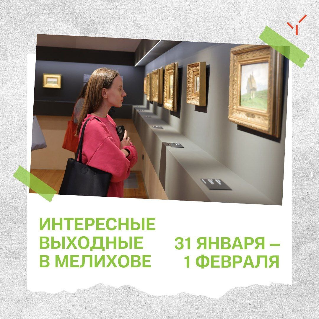 12:00 — программа выходного дня «Новогодний сюрприз». 12:00, 14:00 — сборная экскурсия «Чеховское Мелихово». 14:00 — Музыкальная программа ко дню рождения А.П. Чехова. 14:00, 16:00 — сборная экскурсия по выставке «Левитан и Чехов: поэтика пейзажа». 15:00 — сборная обзорная экскурсия по выставке «Рисунки Чехова». 17:00 — спектакль «Психопаты», реж. Кирилл Лоскутов, Артём Баскаков, Рустем Фесак (Мелиховский театр «Чеховская студия»). ✅1 февраля 11:00 — сборная обзорная экскурсия по выставке «Рисунки Чехова». 12:00, 14:00 — сборная экскурсия «Чеховское Мелихово». 12:00 — детский спектакль «Чижик-пыжик, где ты был...», реж. Евгений Пеккер (Мелиховский театр «Чеховская студия»). 12:00, 15:00 — сборная экскурсия по выставке «Левитан и Чехов: поэтика пейзажа». 13:30 — программа выходного дня «Заглянуть в творческую мастерскую скульптора». 15:00 — экскурсия «Путешествие в Мелихово». 🔺Доступна оплата Пушкинской картой. 🏢 Музей-заповедник А. П. Чехова «Мелихово» 📍 г.о. Чехов, с.