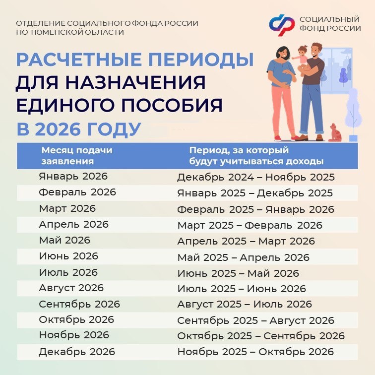 заявления. Пример: если вы подаете заявления в январе 2026 года, в расчет возьмут доходы за период с декабря 2025 года по ноябрь 2025 года. Чтобы вам было проще разобраться, за какие месяцы учитывается доход, мы подготовили информационную карточку⤴️ ✅ Условия назначения пособия: Для получения единого пособия должны соблюдаться следующие условия: 🔹среднедушевой доход семьи не превышает региональный прожиточный минимум (в Тюменской области – 18 939 руб.); 🔹собственность семьи соответствует установленным критериям; 🔹у взрослых членов семьи есть официальный доход либо объективные причины его отсутствия; 🔹минимальный доход каждого трудоспособного члена семьи за 12 месяцев расчетного периода – не менее 8 МРОТ: - МРОТ – 27 093 руб.; - минимальный доход (8 МРОТ) – 216 744 руб. 📝Пособие устанавливается на 1 год. Заявление о продлении можно подать, как в последний месяц получения пособия, так и в месяце, следующим за ним. ✍️Заявление на установление или продление пособия можно подат