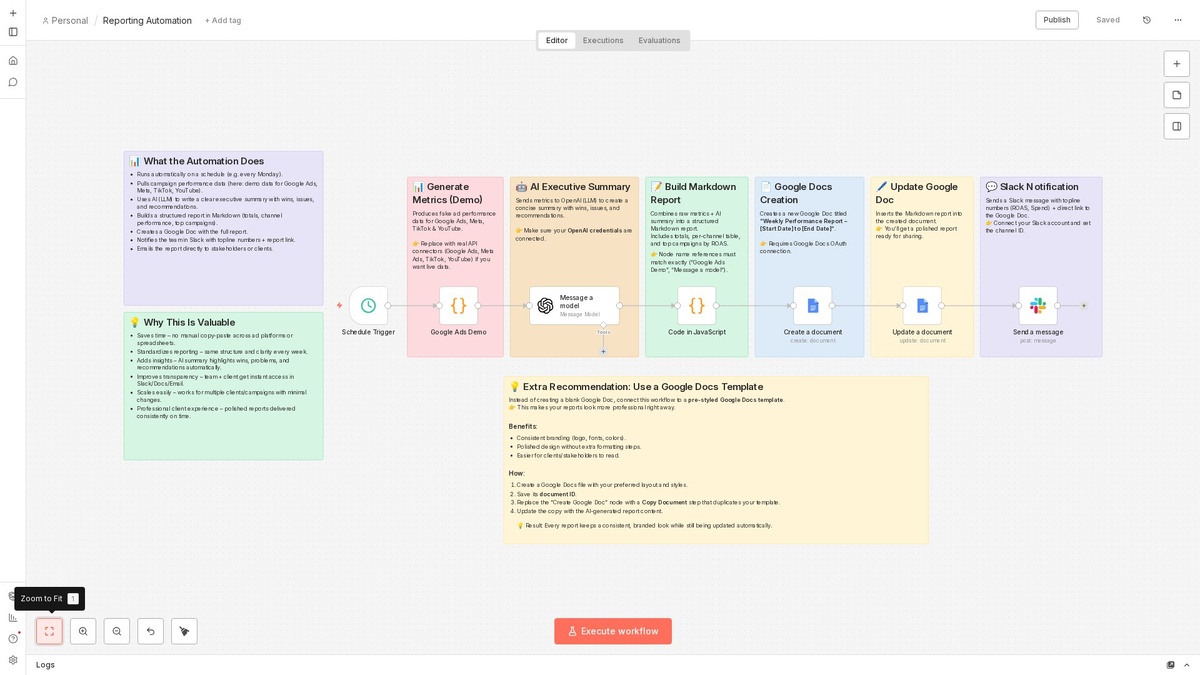 ⚡ Что делает: Каждые 24 часа запускается процесс, который генерирует отчет с помощью OpenAI на основе данных из Sticky Note. Затем создается документ в Google Docs, который отправляется в выбранный Slack-канал. 👥 Кому подойдёт: Подходит командам, нуждающимся в регулярном создании отчетов. 💡 Пример: Автоматический отчет о продажах, собранный из данных за день, отправляется менеджерам каждое утро. 🔗 Ноды: Schedule Trigger, Sticky Note, OpenAI, Google Docs, Slack 📊 Сложность: Сложный #n8n #automation #nocode #googledocs #openai #ai ════════════════ 🎬 YouTube | ⚙️ Канал | 💬 Чат | 📮 Реклама