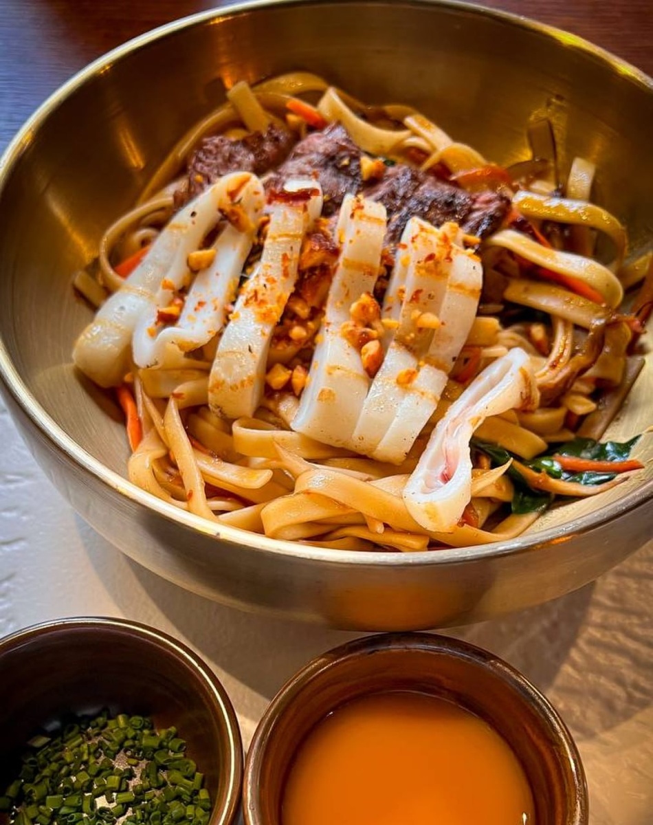 Спешл для фаранга 🥢 В такой холод хочется почувствовать аромат хоспера и оказаться в атмосфере уютной мясной гостиной. Зашли с коллегами на обед — а тут Азия Спешл меню. Наверняка для тех, кто недавно вернулся из Азии с каникул. Или для тех, кто не улетел. В меню: фо-бо, стриплойн в сакэ и соевом соусе, вок с мачете и кальмаром, свиные рёбра в азиатской глазури (сегодня закончились), моти и тройка напитков. Взяли стриплойн и вок. Вок — хороший. Такой сёрф-энд-тёрф: лапша в сладковатой вуали соуса, слегка обжаренные хрустящие овощи, ломтики мяса и колечки кальмара. Всё на месте. А вот стриплойн заставил почувствовать себя наивным фарангом на Каосан Роуд. Он больше походил на татаки. Но татаки — закуска, а здесь позиционируется как основное блюдо. Соус и ферментированный перец яркие, но их много — мясо за ними теряется. Заменить на курицу или что-либо другое — и не заметишь разницы. Перец как акцент — кайф, но буквально 3-4 горошка было бы достаточно. А тут осторожничаешь, чтобы лишн