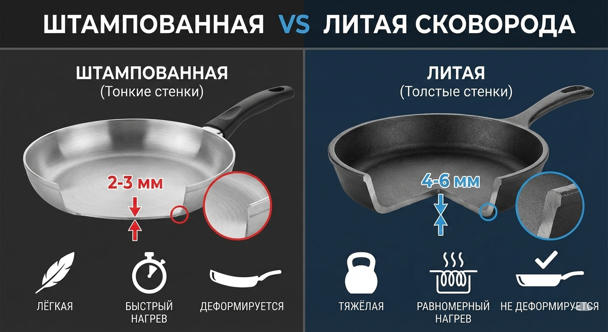 Штампованные сковороды (300-1000₽) — из тонкого листа алюминия методом штамповки. Тонкие стенки (2-3 мм), лёгкие, быстро нагреваются, но ДЕФОРМИРУЮТСЯ от высокой температуры. Через 2-3 месяца дно выгибается "горбом", сковорода шатается на плите.