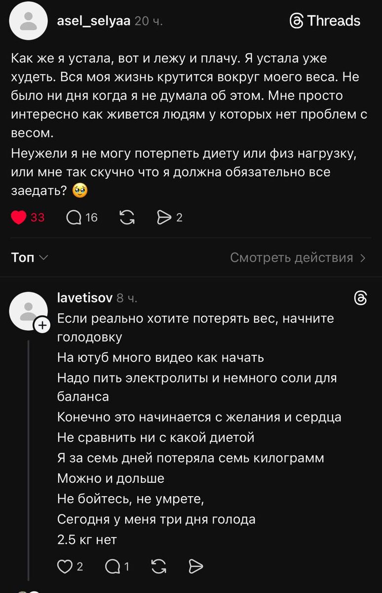 🤬 Когда люди дают советы, они даже не думают, что их советы могут тупо навредить человеку- «мне помогло, давай и ты попробуй». Человеку с РПП категорически противопоказаны любые формы ограничения (а тут голодать советуют 😤). Любое ограничение усиливает симптоматику РПП. Хочешь чтобы твоя жизнь начала крутиться вокруг еды, твоего веса, самобичевания, ненависти к себе- просто сядь на диету. В общем, в тредс я уже поругалась 👌🏻