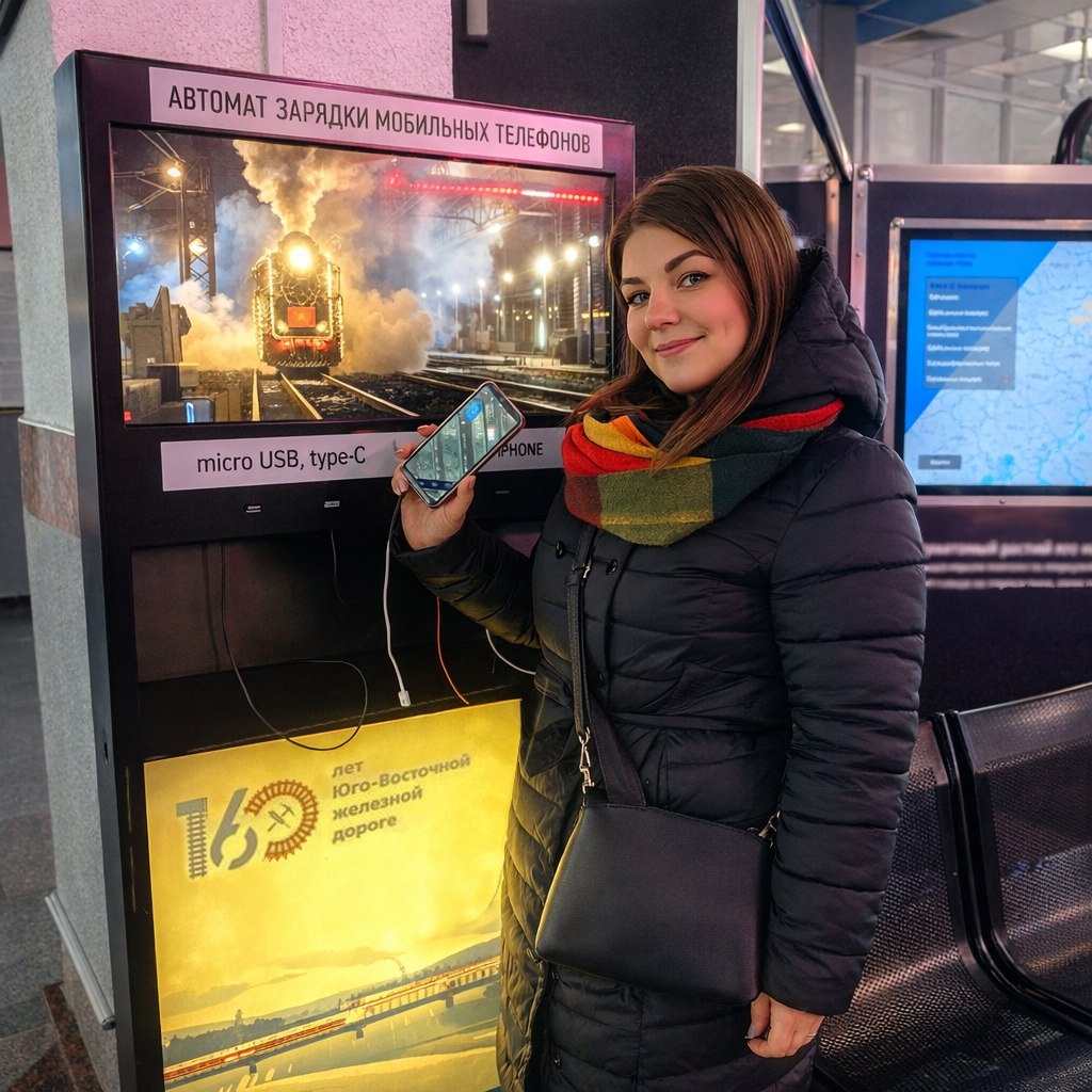 Зарядные станции установлены в кассовом зале на первом этаже и в зоне ожидания на втором этаже. Они оборудованы встроенными кабелями, которые подходят для зарядки большинства типов портативной электроники. Также подведены розетки с напряжением 220 V. С помощью станций пассажиры круглосуточно могут не только заряжать гаджеты, но и получать справочную информацию о маршрутах и сервисах РЖД. В планах расширить контент, который транслируется на экранах автоматов. Подписаться на 🗞🗞 | Поддержать бустом