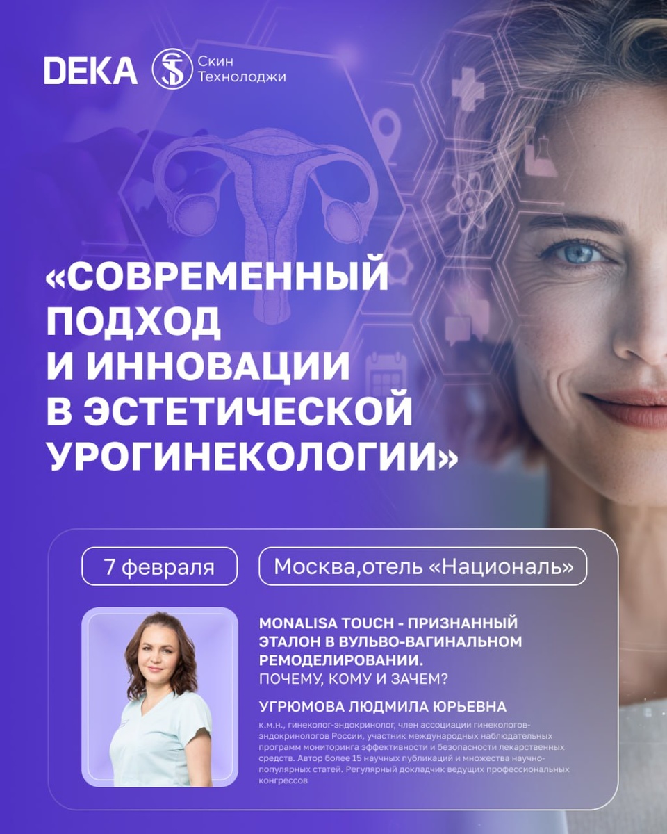в эстетической урогинекологии». Компания DEKA примет активное участие в мероприятии, где соберутся сотни профильных специалистов: гинекологи, урологи, эндокринологи, дерматовенерологи, сексологи и психотерапевты. 🤍Особое внимание — технологии MonaLisa Touch От компании DEKA с докладом выступит Угрюмова Людмила Юрьевна — к.м.н., гинеколог-эндокринолог, член Ассоциации гинекологов-эндокринологов России, автор более 15 научных публикаций и постоянный докладчик ведущих профессиональных конгрессов. Тема доклада: «MonaLisa Touch — признанный эталон в вульво-вагинальном ремоделировании. Почему, кому и зачем?» Конференция станет площадкой для обсуждения современных научных подходов и эффективных клинических решений в эстетической урогинекологии. Время доклада: 12:20 Зарегистрироваться можно на сайте 🤍