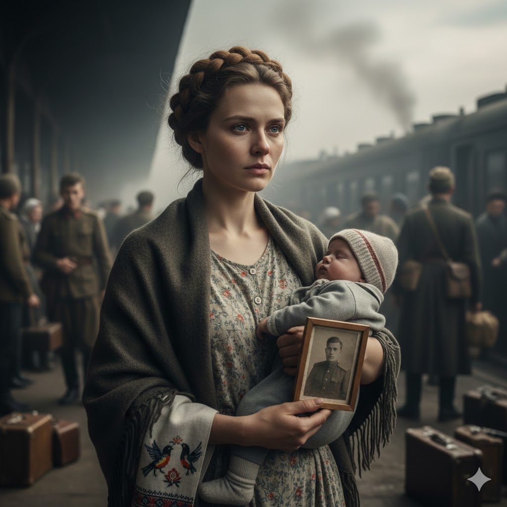 Дарья осталась на перроне с годовалой Настенькой на руках. Вокруг неё бушевал океан человеческого горя, но она стояла неподвижно, как скала. В голове стучала только одна фраза: «Сбереги дочь».