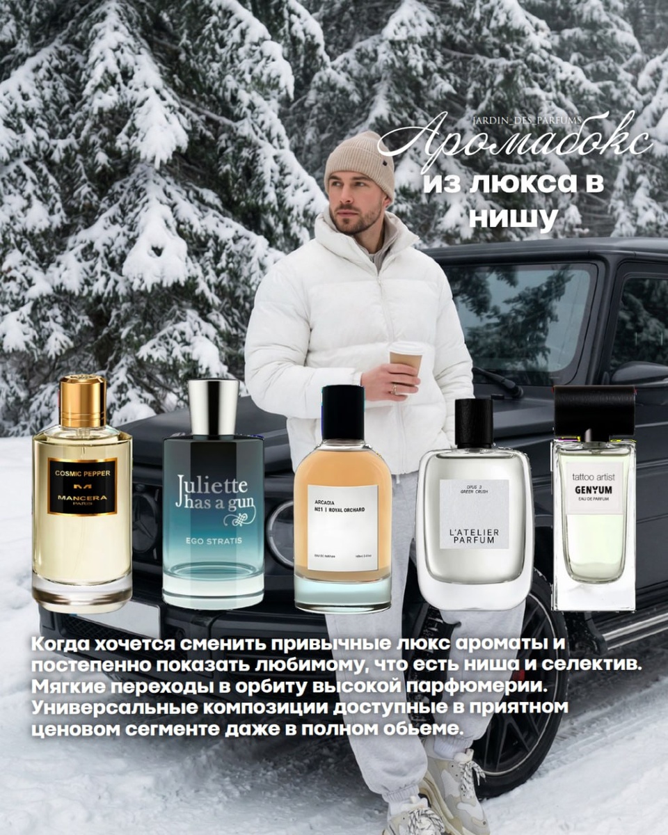 Аромабокс "Из люкса в нишу" Mancera Cosmic Pepper Juliette Has A Gun Ego Stratis Arcadia No 1 Royal Orchard Genyum Tattoo Artist L'Atelier Parfum Green crush