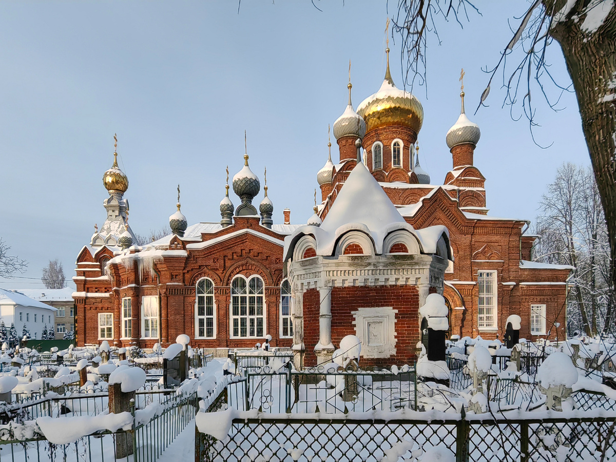 В этой заметке я хочу показать вам одну из самых главных исторических достопримечательностей Бежецка - кафедральный собор Спаса Нерукотворного Образа (кладбищенскую церковь) Первоначально на этом месте было решено построить каменный храм Воскресения Христова. Строителем-меценатом стал купец Илья Фёдорович Неворотин. Возведение храма началось в 1787 году и было завершено в 1796 году. Особняк Неворотина в Бежецке я вам показывал в прошлой заметке. В 1796 году городской голова Михаил Лукич Ревякин попросил храм переименовать и вместо праздника Воскресения Христова (29 августа), утверждённого Екатериной II в 1771 году, праздновать день Нерукотворного образа Спасителя Иисуса Христа (16 августа). И в 1800 году храм был освящён в честь Нерукотворного образа. В 1895- 1898 годах году на месте маленькой кладбищенской церкви был построен большой Спасский собор, который и сохранился до наших дней. Инициатором строительства стал протоиерей И.И. Преображенский (его могила находится у стен храма, но