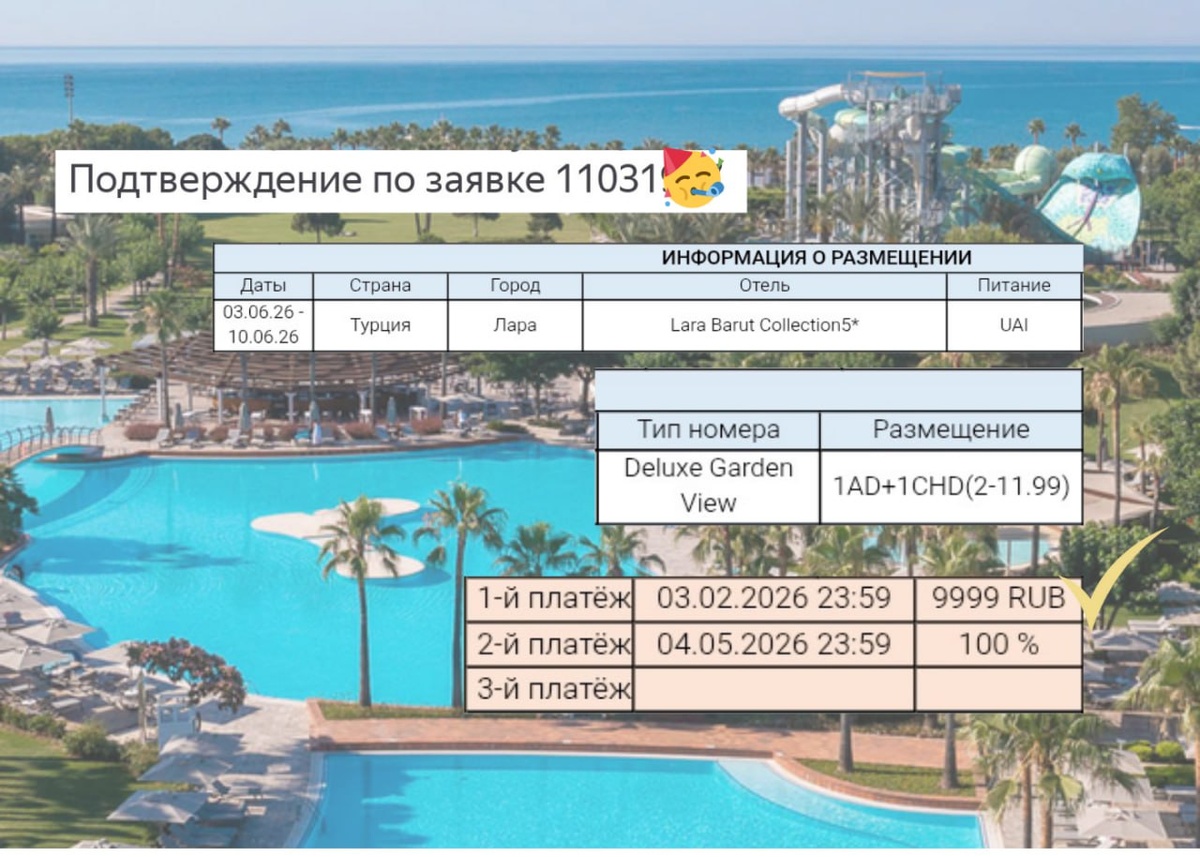 ! Не можем не напомнить вам, что второй этап раннего бронирования заканчивается 31 января, а это значит, что еще есть возможность забронировать тур с минимальной предоплатой по выгодной цене! С 1 февраля условия изменятся! На скрине — пример разбивки платежа при бронировании тура в Турцию на начало июня, в отличный отель Lara Barut Collection 5*: туристы внесли всего 10 тыс руб* сейчас, а доплата за месяц до вылета уже зафиксирована в валюте. *условия по оплате зависят от конкретного отеля и оператора. Мы ни на что не намекаем 😚, но мы на связи ➡️ @yuliatraveltoday!