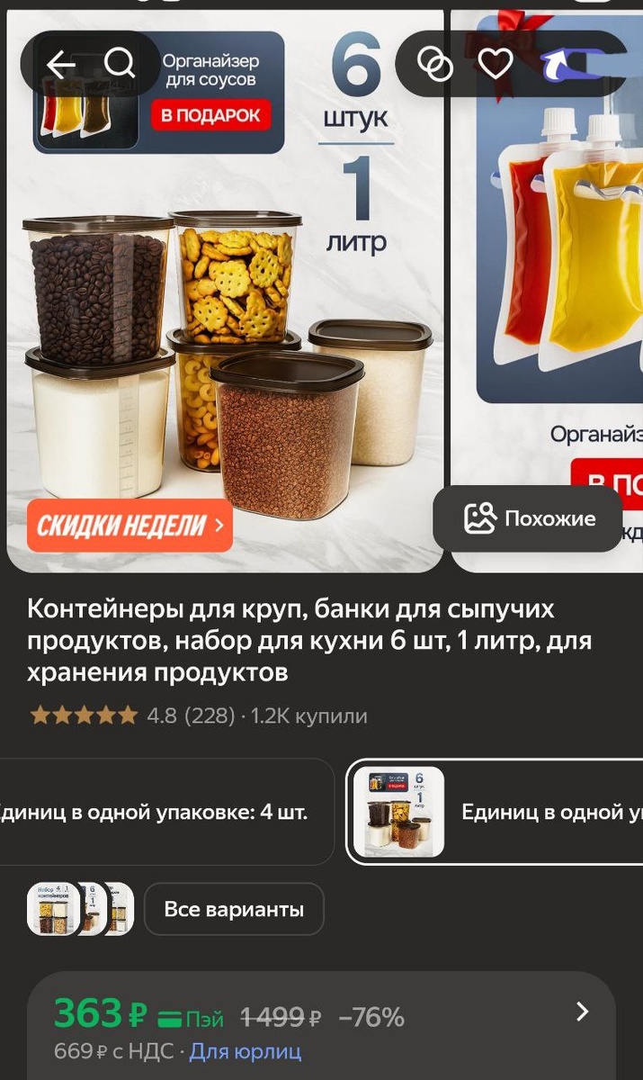 💻Контейнеры для круп, банки для сыпучих продуктов, набор для кухни 6 шт, 1 литр, для хранения продуктов + органайзер для соусов - 363р (я.пэй)