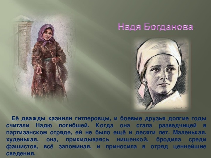 Вечная память пионерке-героине Надежде (Наденьке) Богдановой.