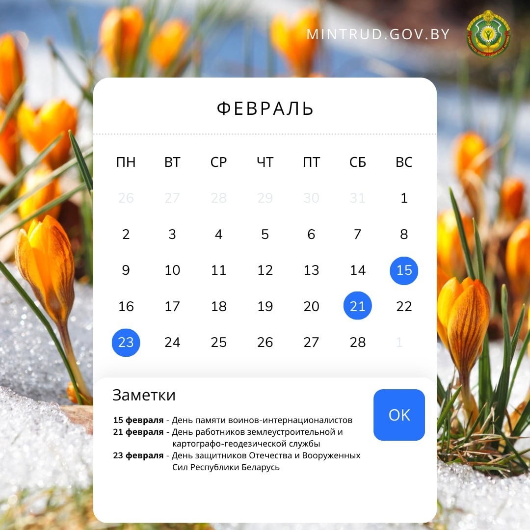 В Минтруда рассказали, сколько белорусы будут работать в феврале В последнем месяце зимы 2026 года белорусы будут работать 20 или 24 дня в зависимости от графика, сообщили в Министерстве труда и социальной защиты. В феврале, который составляет 28 дней, при пятидневной рабочей неделе будет 20 рабочих дней и 8 выходных. При шестидневной рабочей неделе количество рабочих дней увеличивается до 24, а выходных – сокращается до 4. Расчетная норма рабочего времени при 40-часовой рабочей неделе составит 160 часов. Эта норма едина как для пятидневной, так и для шестидневной рабочей недели. Напомним, расчетная норма рабочего времени на 2026 год была установлена постановлением Министерства труда и социальной защиты от 16 сентября 2025 года № 95.